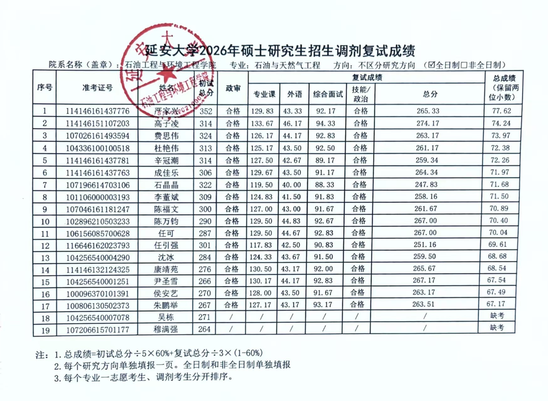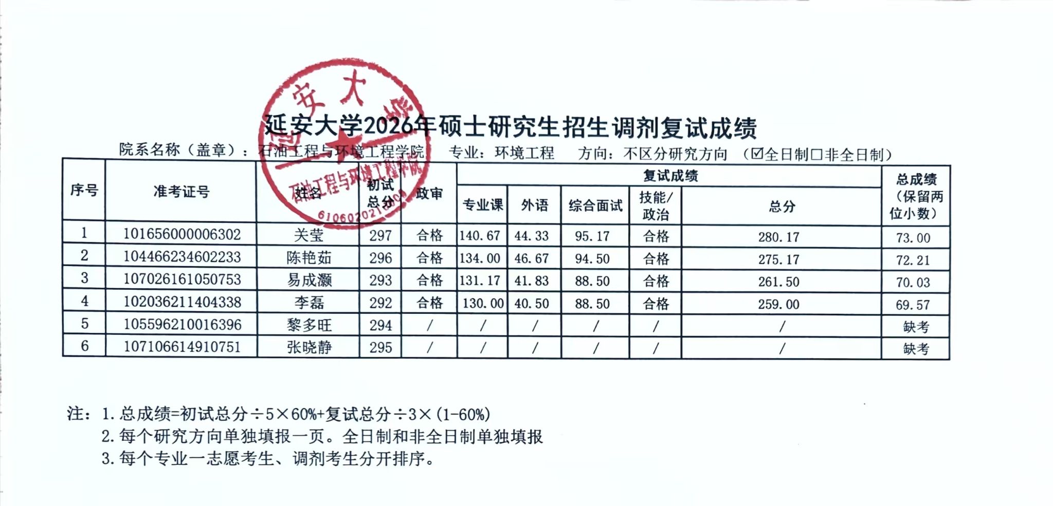 石油工程与环境工程学院2026年硕士研究生招生第一批次调剂考生成绩公示